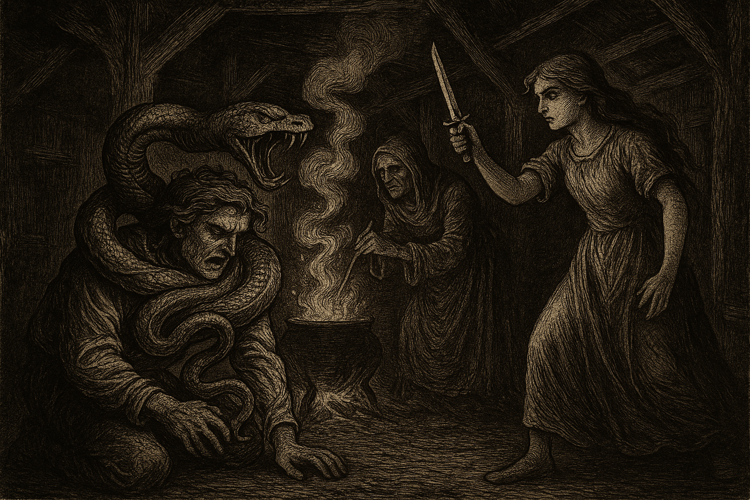 Zakliaty princ blúdil po svete, neschopný oslobodiť sa od stvorenia, ktoré sa stalo jeho väzením. Až keď sa dostal k domu múdrej ženy a jej odvážnej dcéry, objavila sa iskra nádeje. Dievčina, ktorá si ho zamilovala, sa rozhodla riskovať vlastný život. Pripravila spolu s matkou kotol plný byliniek, do ktorého princa ponorili až po krk. Keď sa Beithir odlepil od jeho tela, dievčina ho jediným sekom noža oddelila. V niektorých verziách rozprávky ju to stálo časť vlasov alebo dokonca ruky, ale podarilo sa jej princa vyslobodiť.